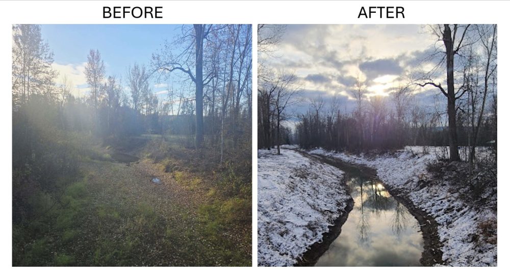 The side channel was carefully excavated below the surrounding groundwater level, ensuring water remains present even during low river conditions. This design allows the channel to maintain continuous connectivity and aquatic habitat throughout the year.