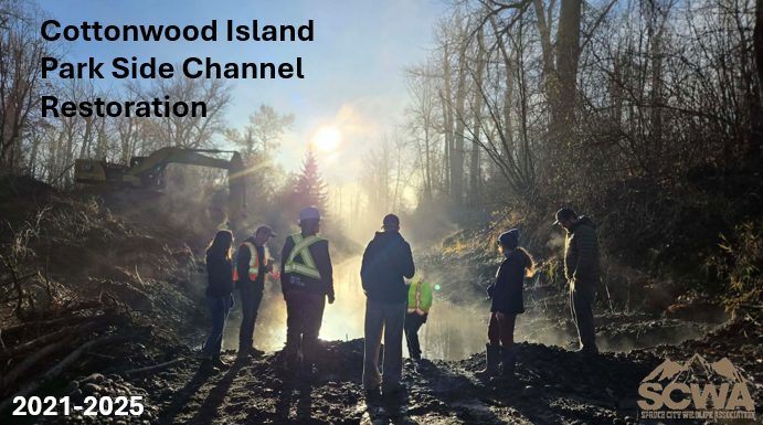 Spruce City Wildlife Association (SCWA) has successfully completed the Cottonwood Island Park Side Channel Restoration Project, restoring natural function to a 1.4-kilometer side channel of the Nechako River and securing long-term fish habitat within this important urban greenspace.
